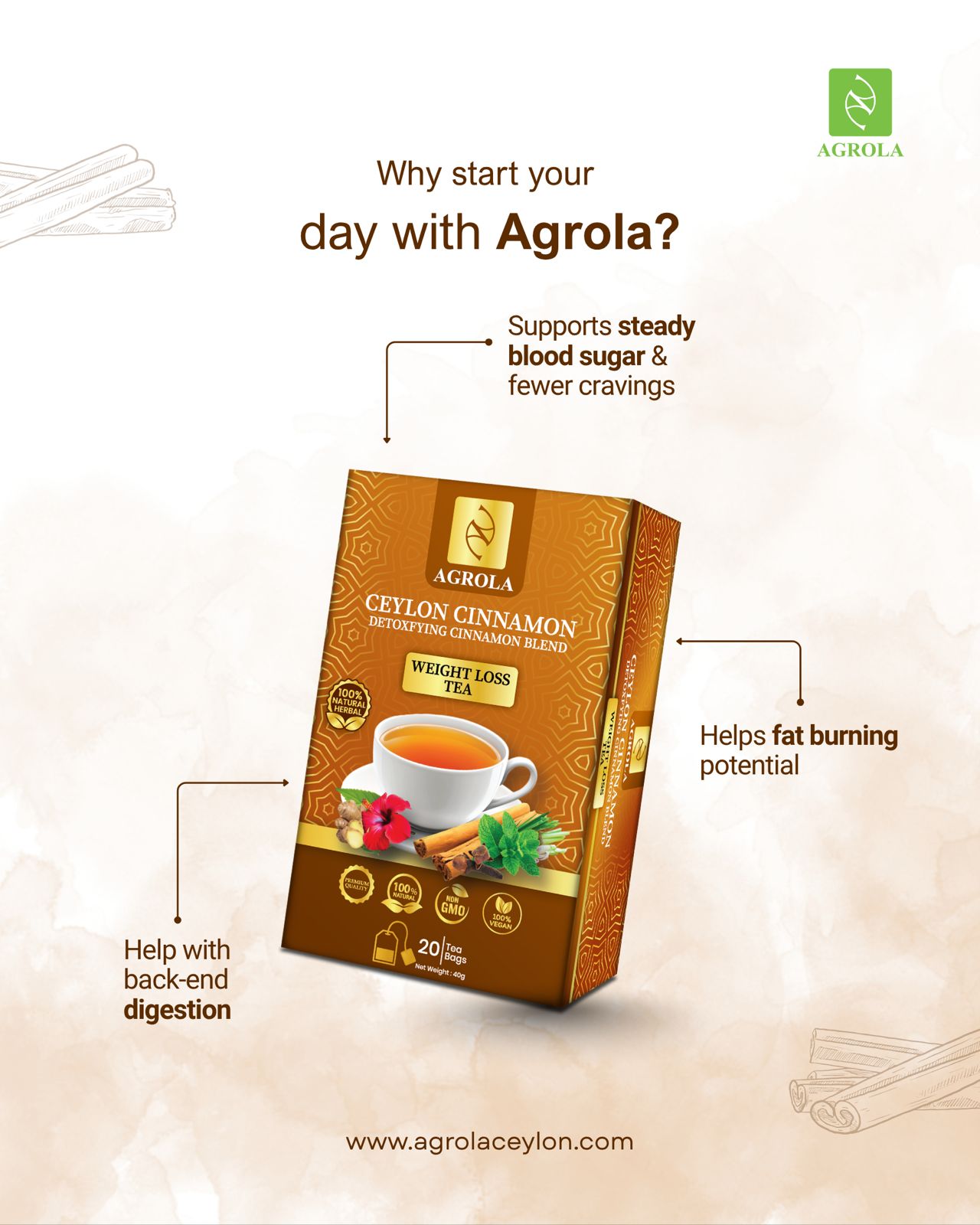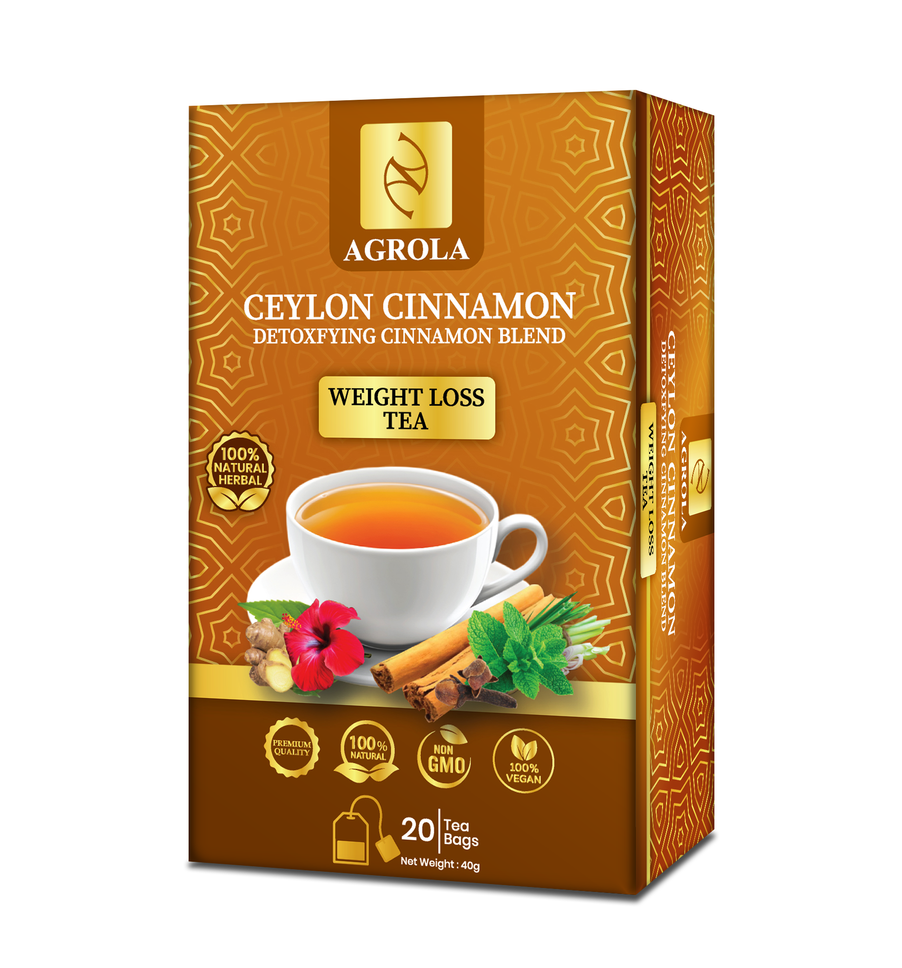 Experience natural wellness with AGROLA Ceylon Cinnamon Detox & Weight Loss Tea, a premium Slimfit herbal infusion crafted with 100% pure Ceylon cinnamon and carefully selected detoxifying herbs. This caffeine free Ayurvedic blend supports weight management, boosts metabolism, improves digestion, and promotes overall body balance. Ideal for daily detox, fat burning, and natural vitality without additives or preservatives.